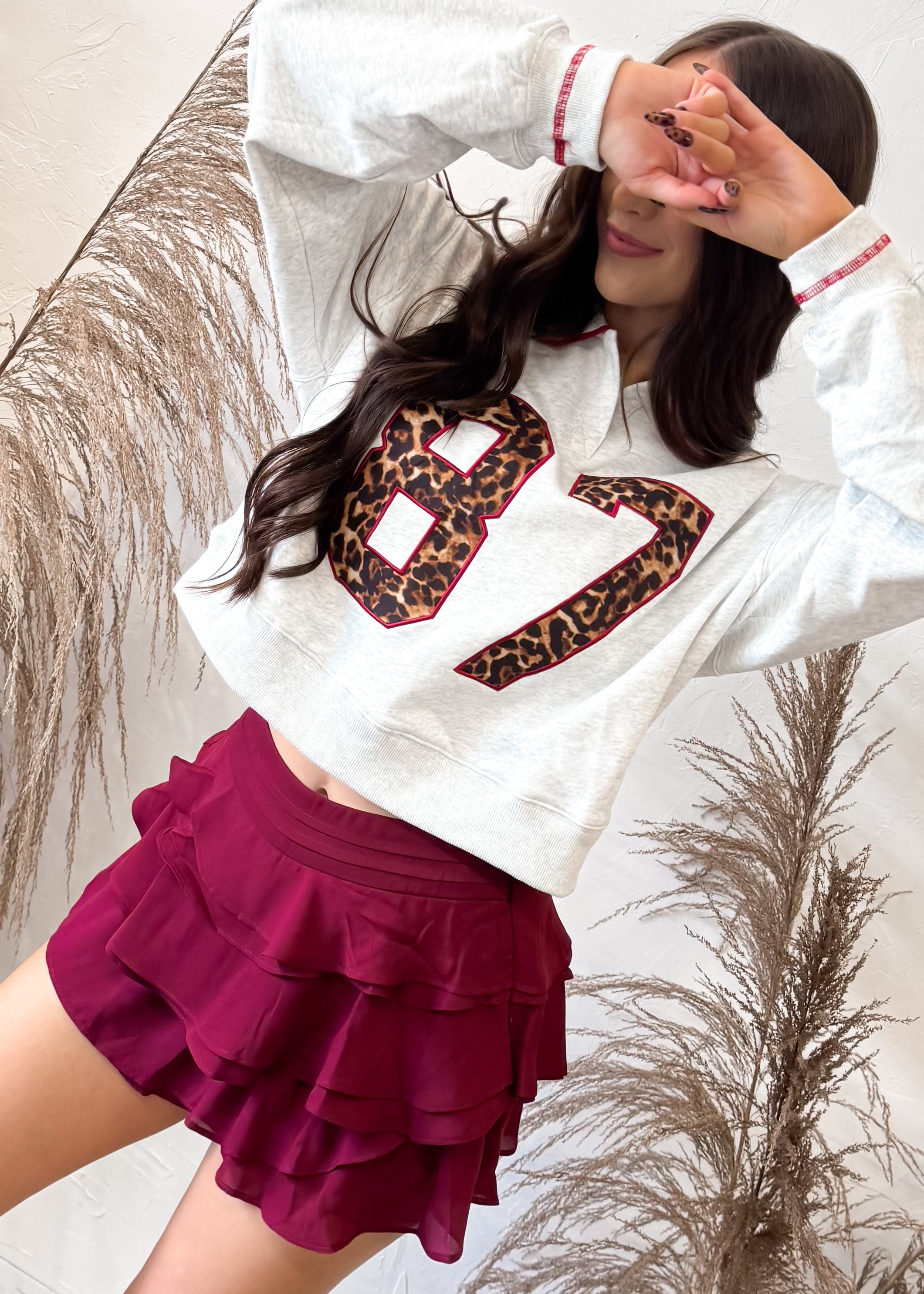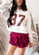 This piece looks like a skirt but hides comfy built-in shorts, so you can dance, cheer, or stroll around town without worry. The rich cabernet hue and tiered ruffles give it the perfect mix of playful and chic—ideal for game days, holiday parties, or a dressed-up casual brunch look.