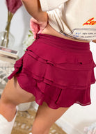 Meet the Cabernet Kiss Ruffle Skort in Burgundy—a flirty, layered mini that’s secretly practical.