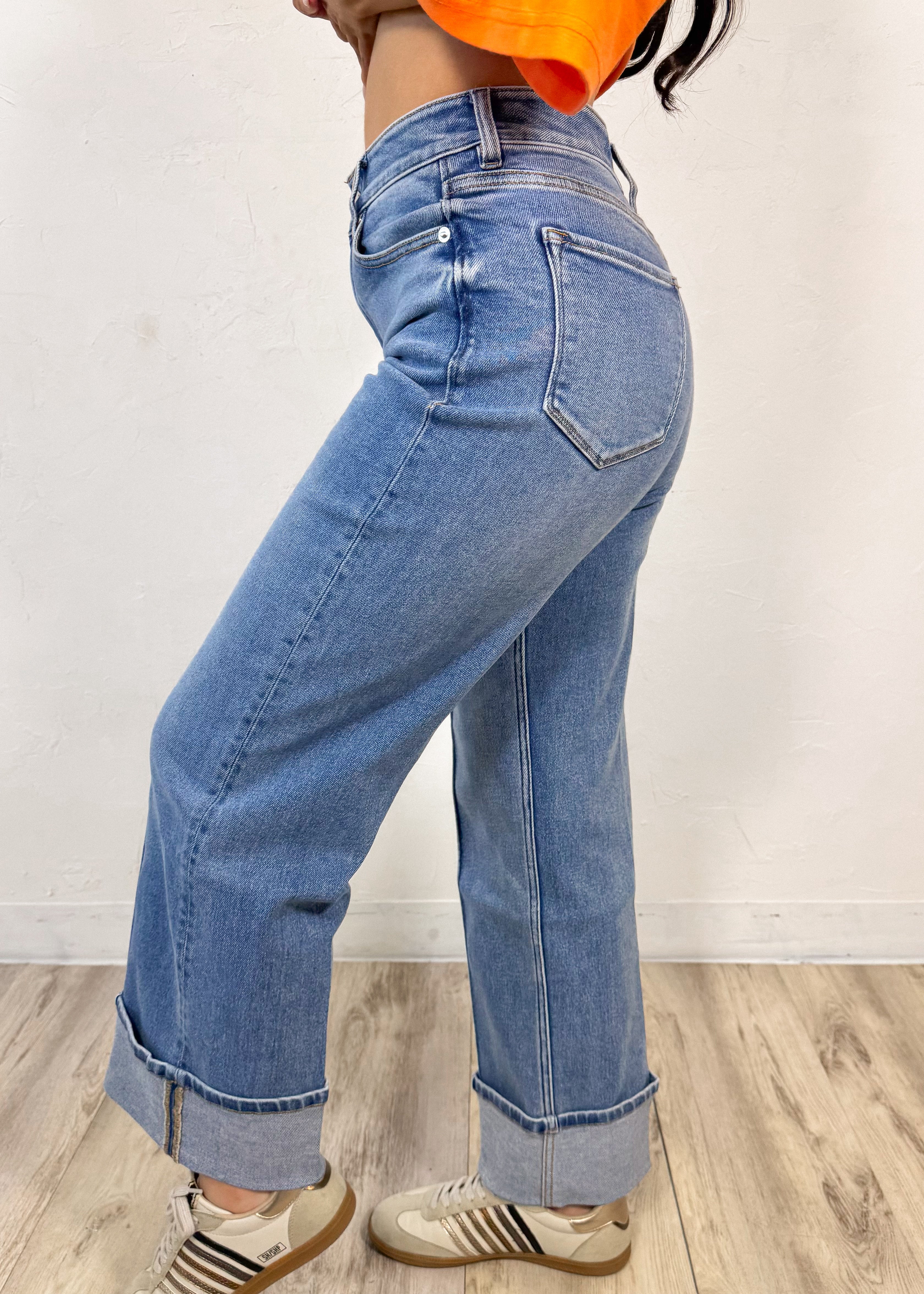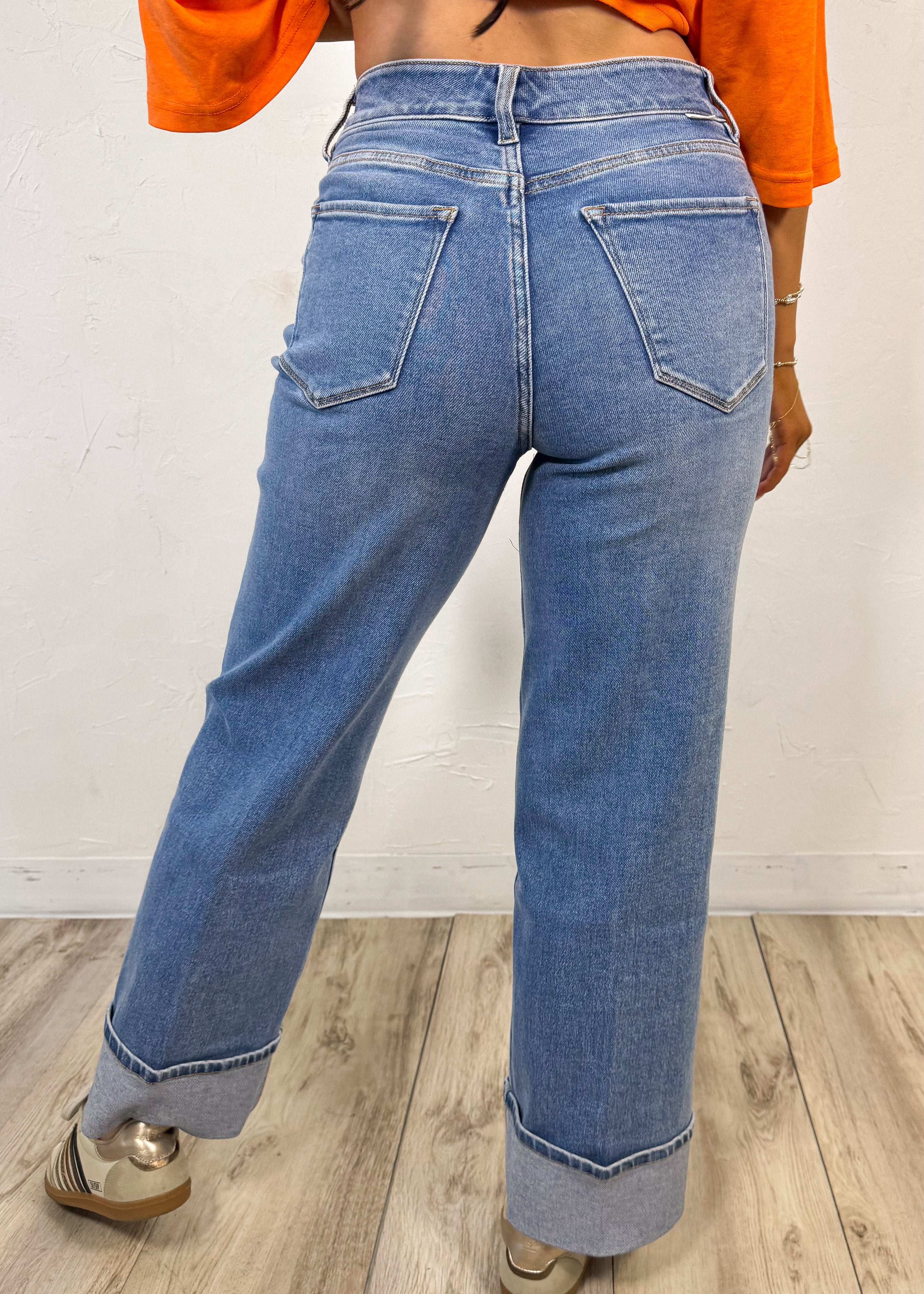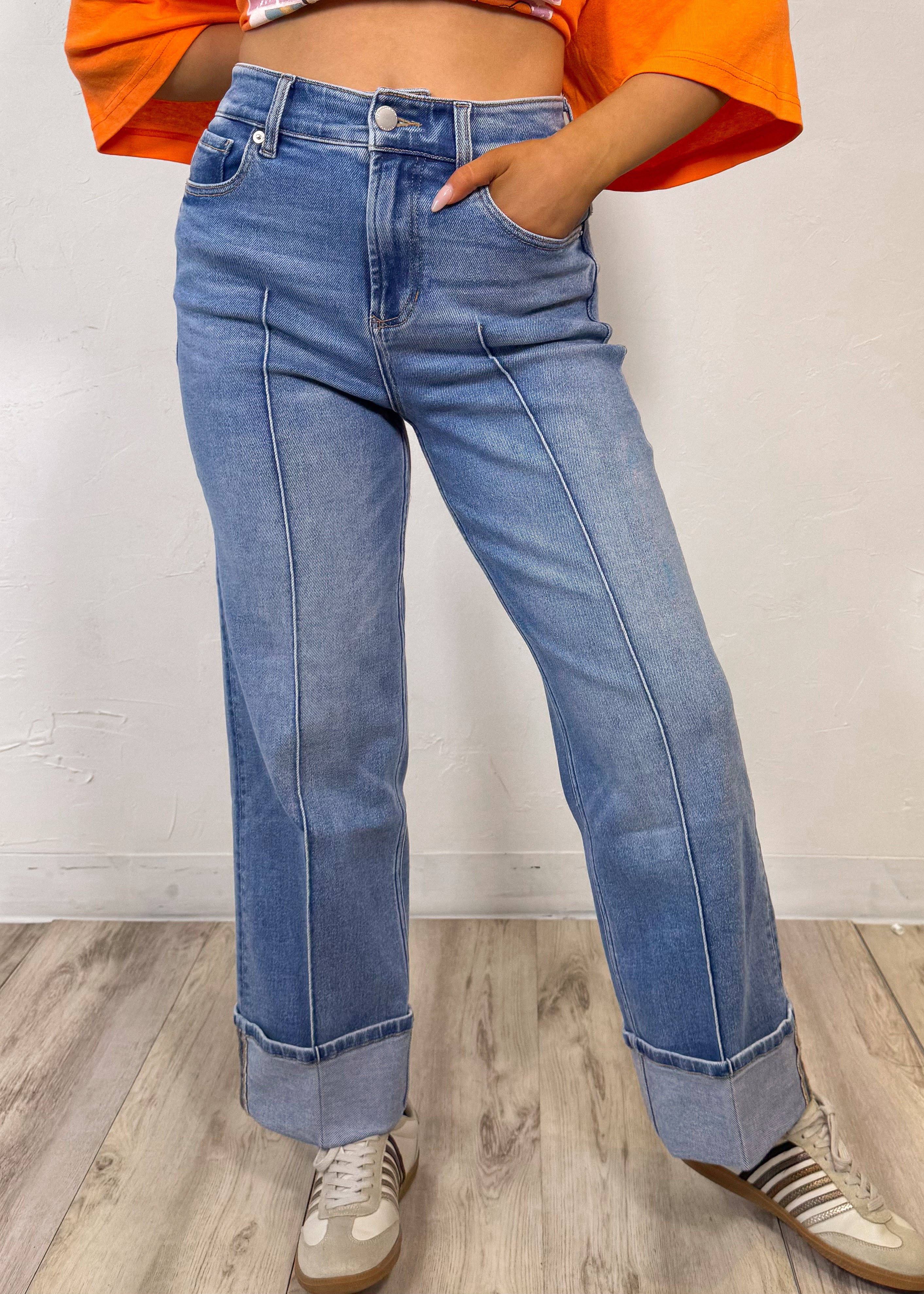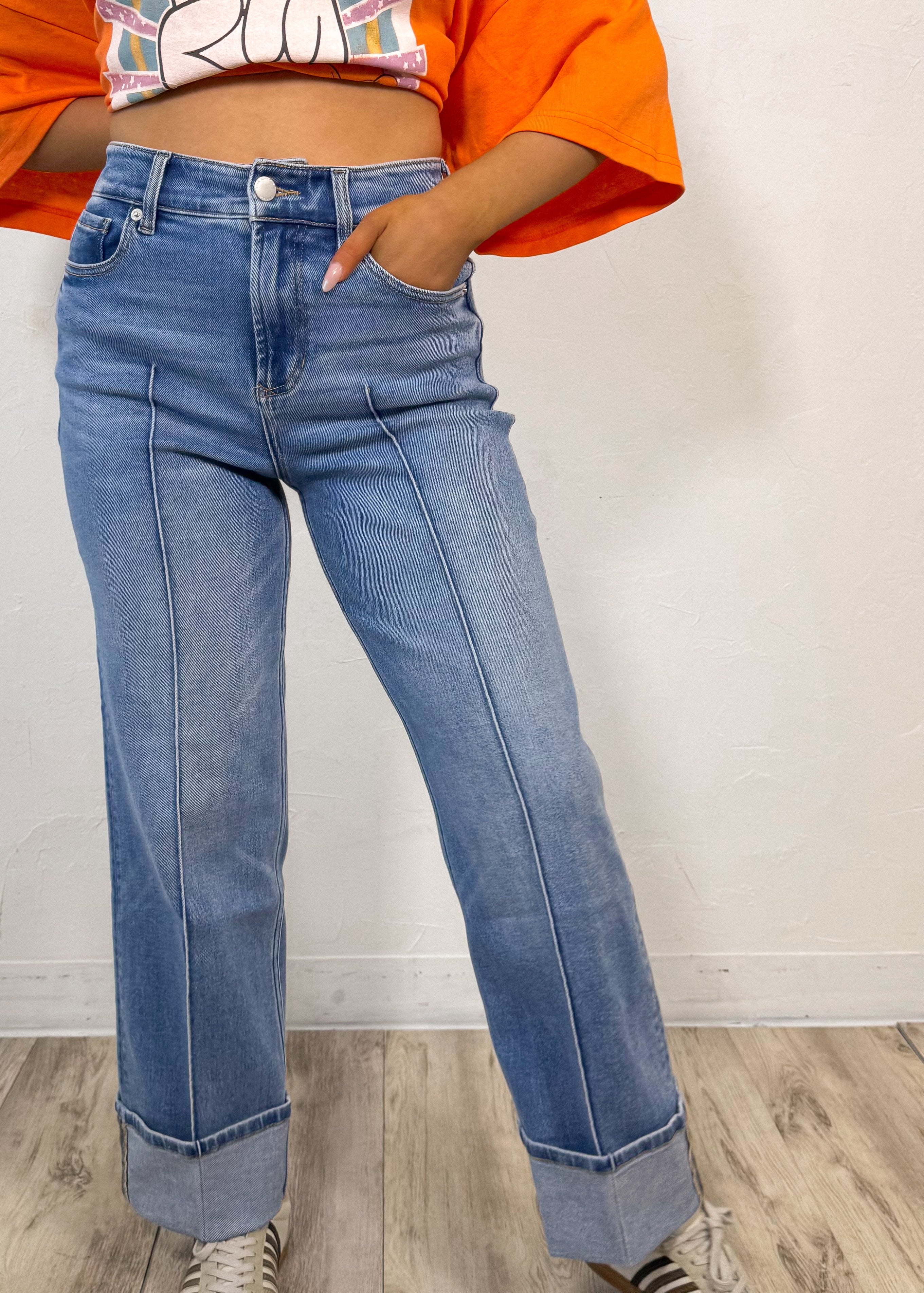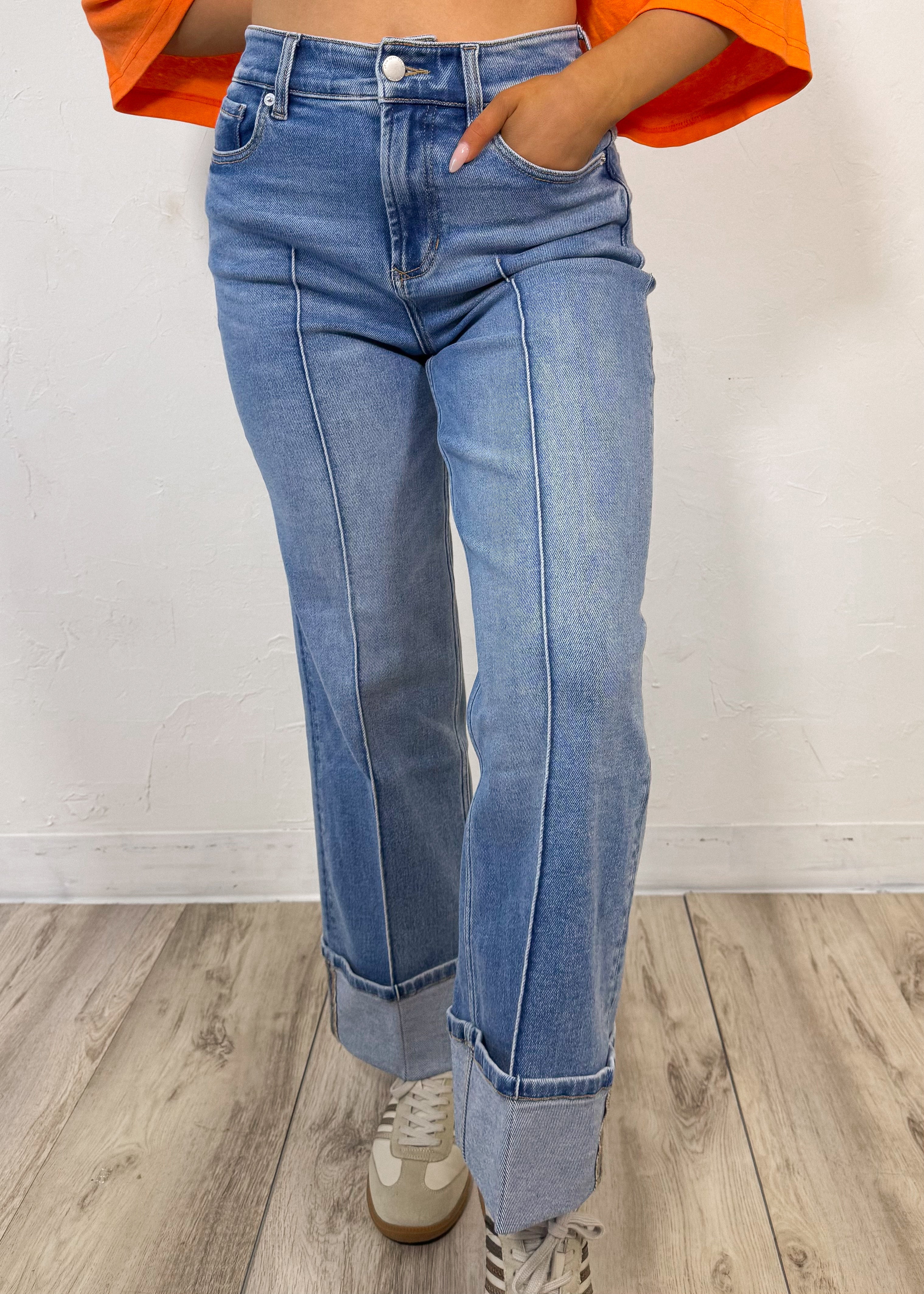 Featuring a high-rise fit, structured waistband, and subtle front seam detail that elongates the legs, they give you that elevated, on-trend look while still being easy to wear. The wide cuffed hem adds the perfect statement finish and makes them look so intentional styled with sneakers, sandals, or a little heel.