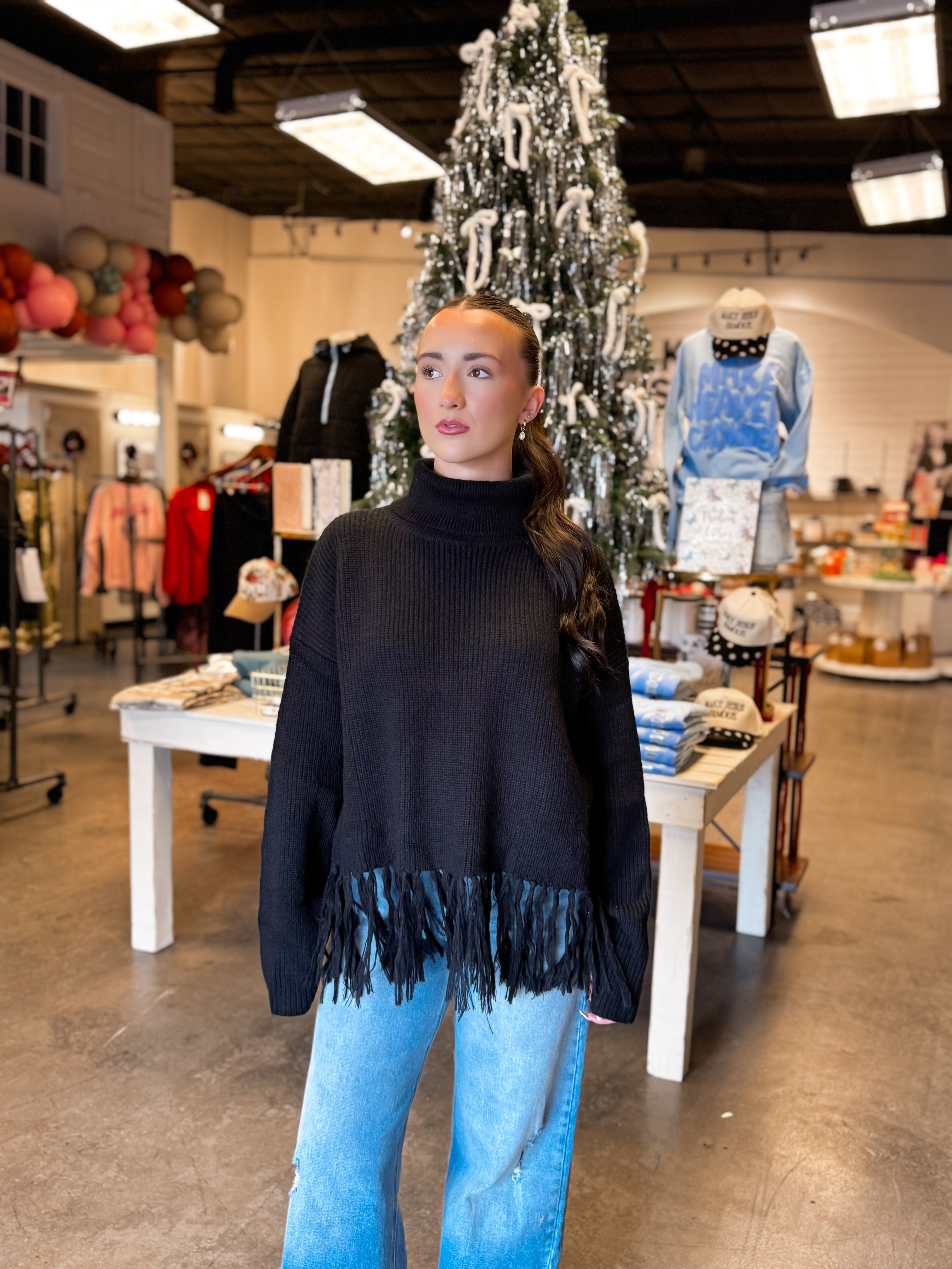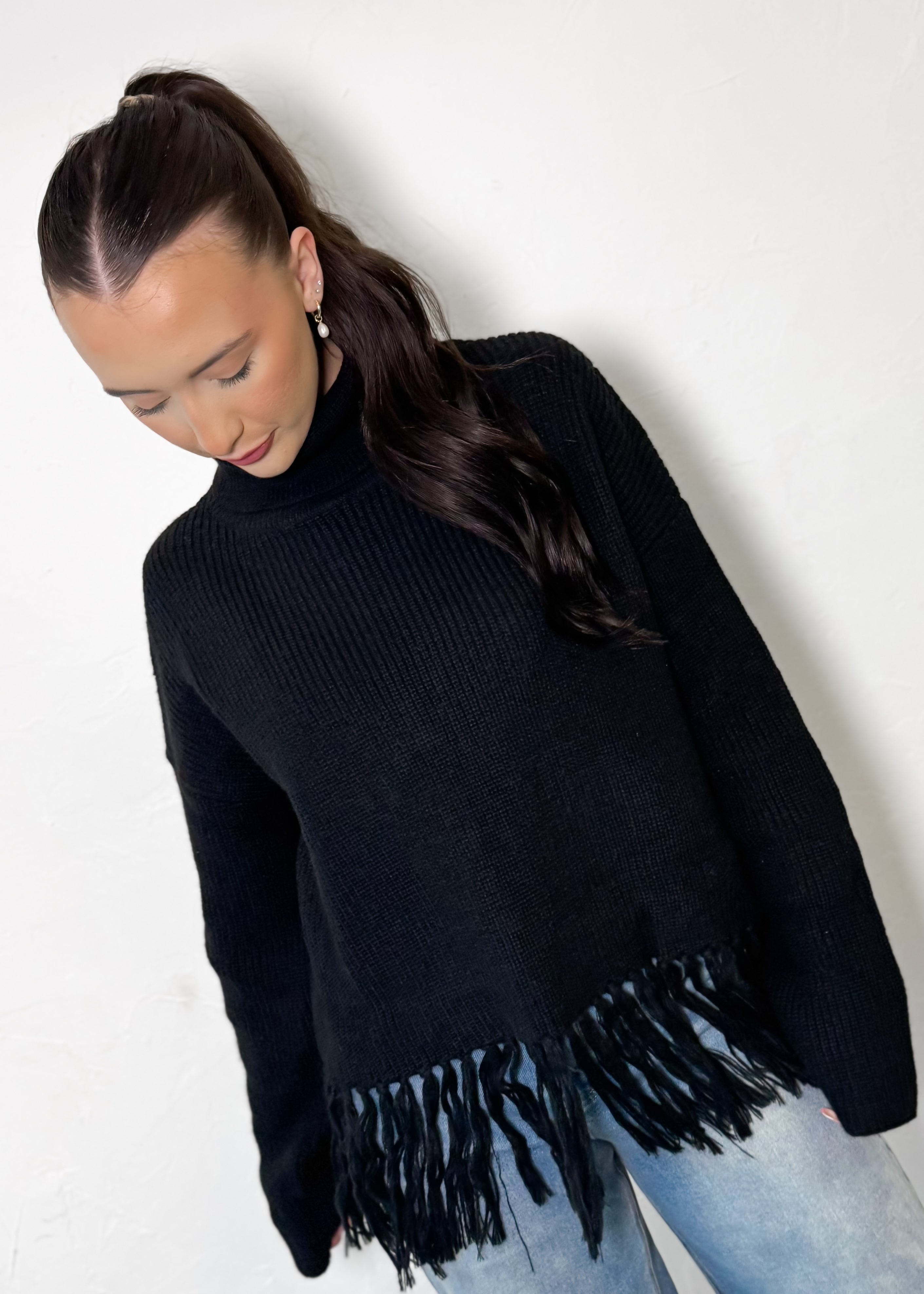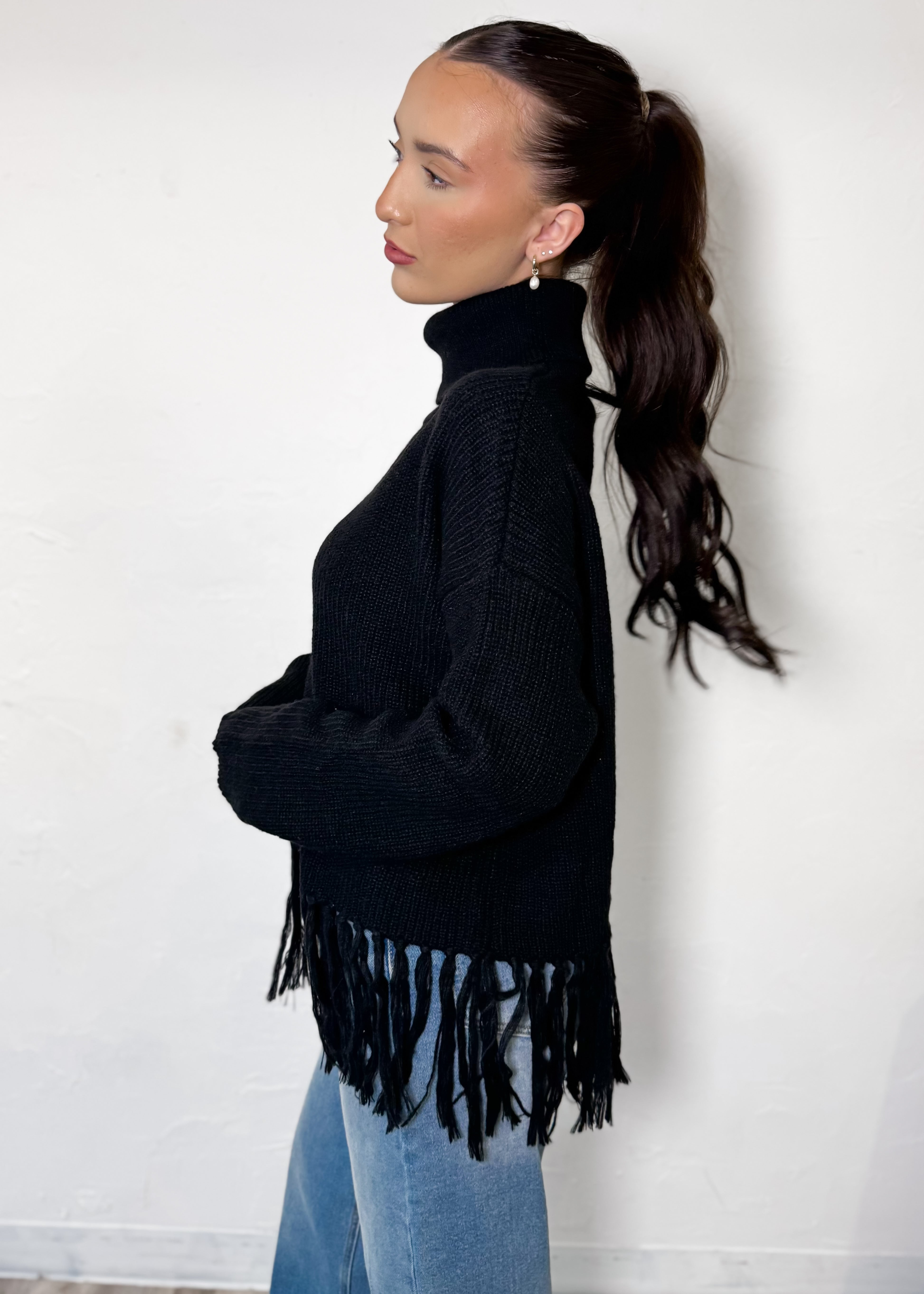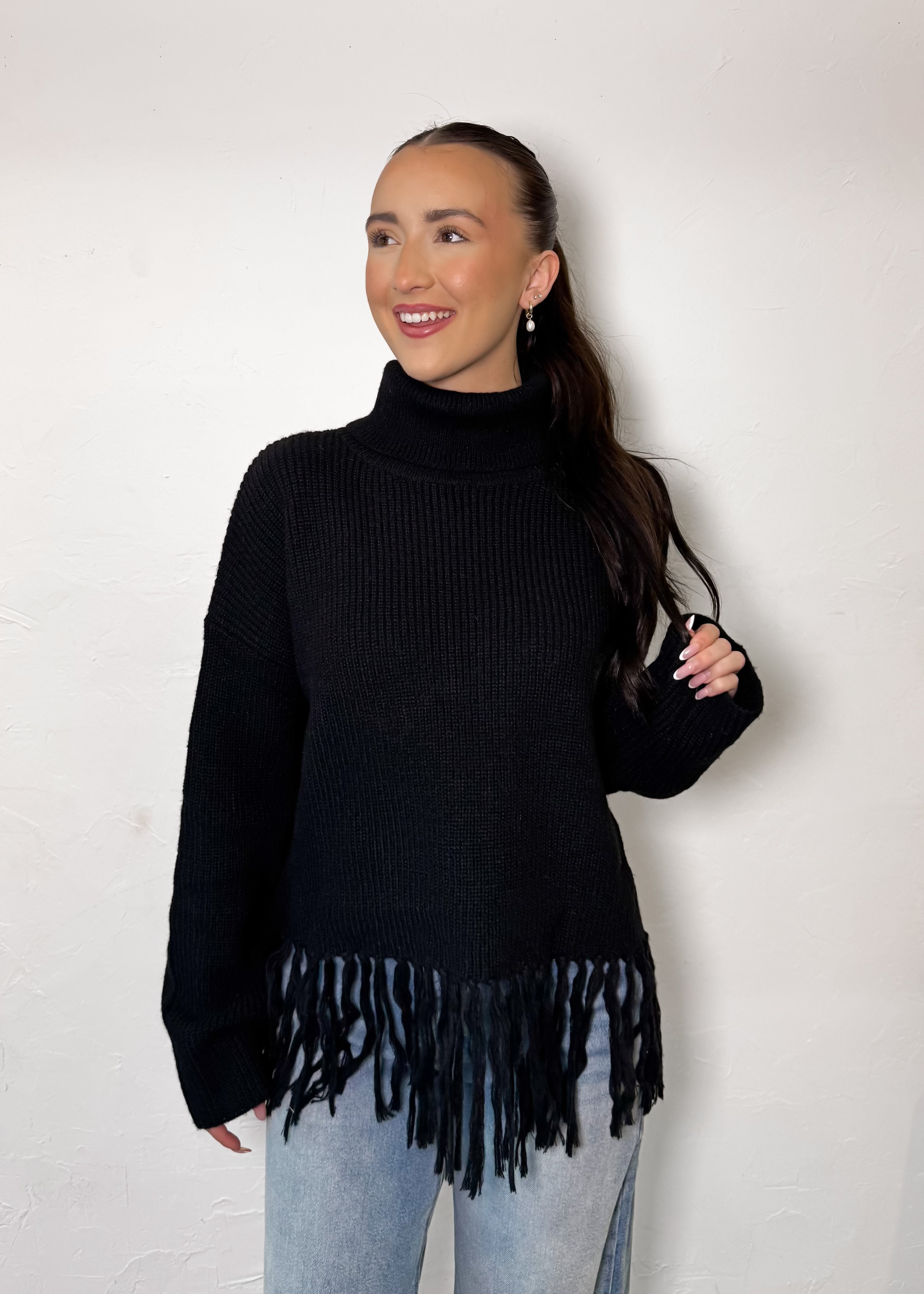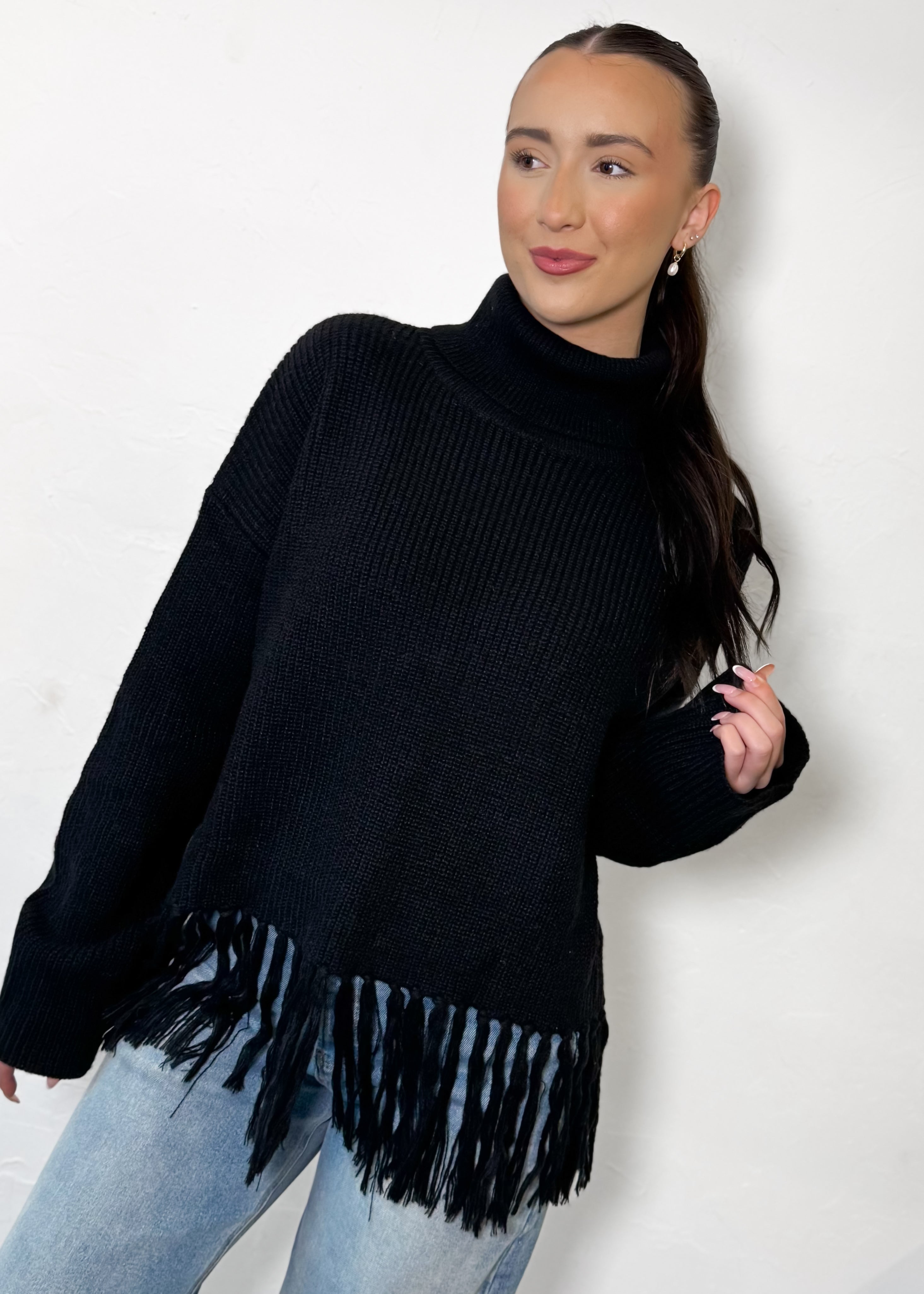 The After Hours Fringe Sweater is where cozy meets a little drama—in the best way. Designed with a sleek turtleneck and finished with fringe detailing along the hem, this sweater instantly elevates a classic silhouette while still feeling effortless and wearable.