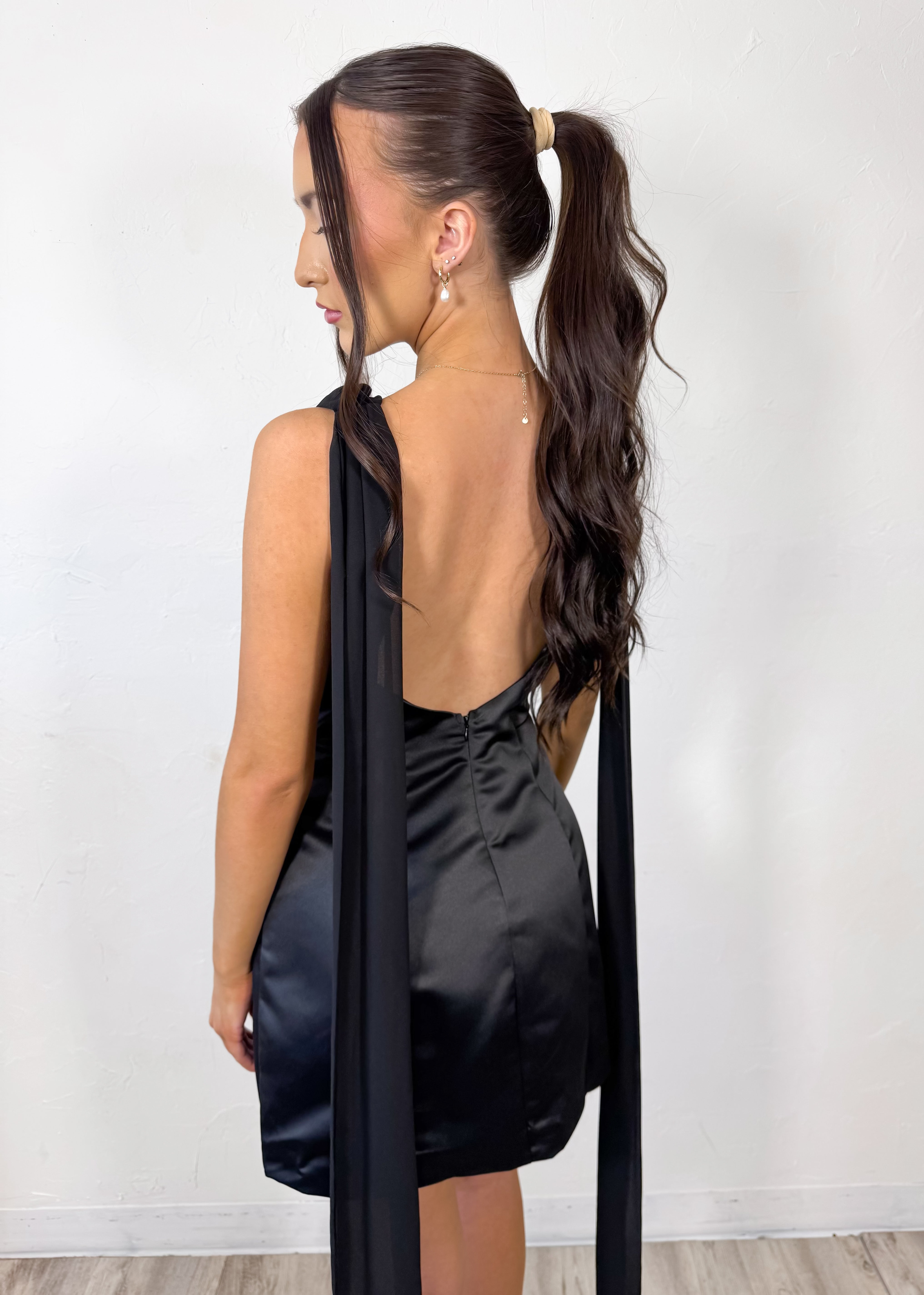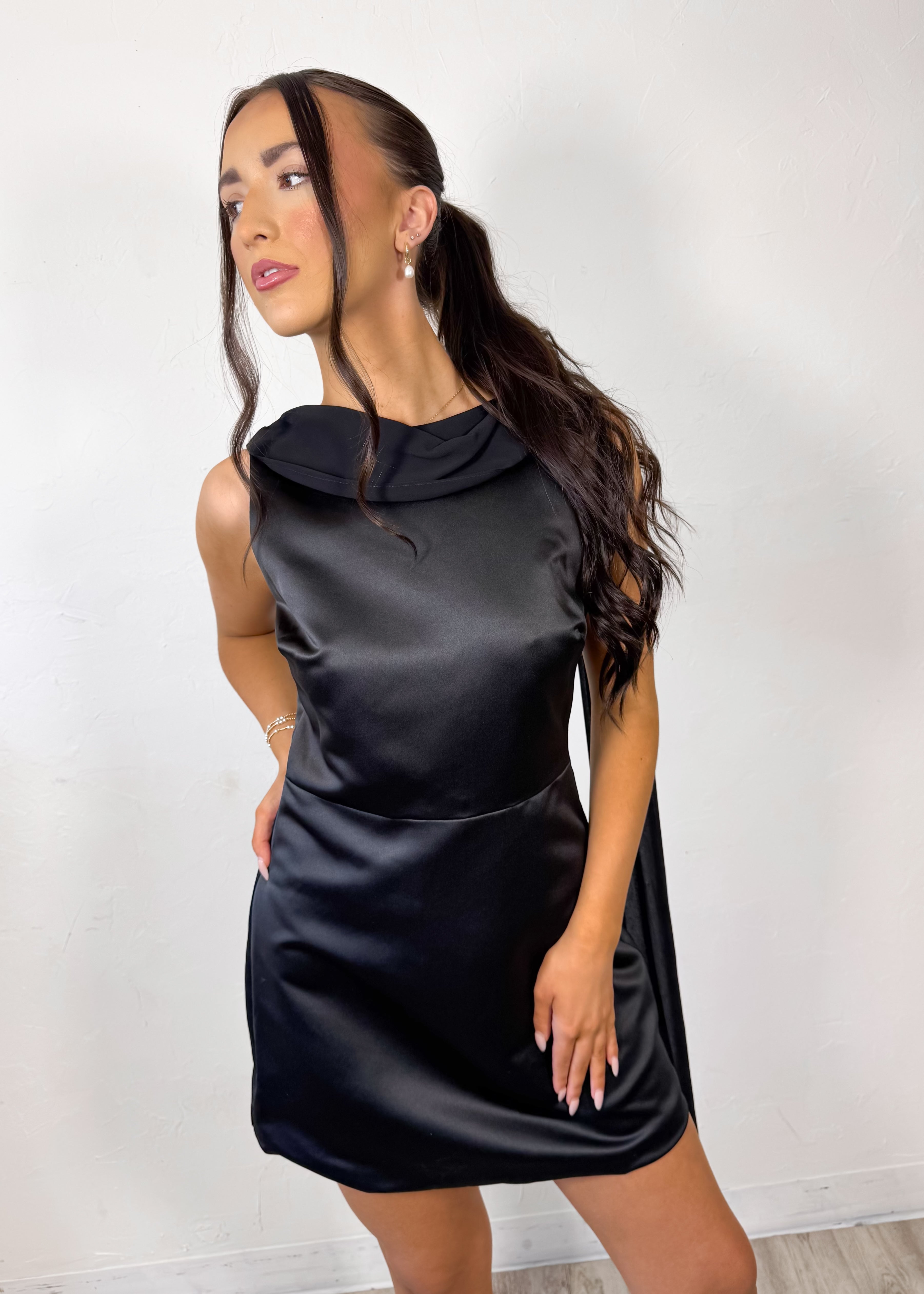 Designed with a soft draped neckline and a beautiful open back detail, this mini dress creates the perfect balance of sophistication and statement. The satiny fabric gives it a subtle glow while the tailored fit flatters in all the right places.