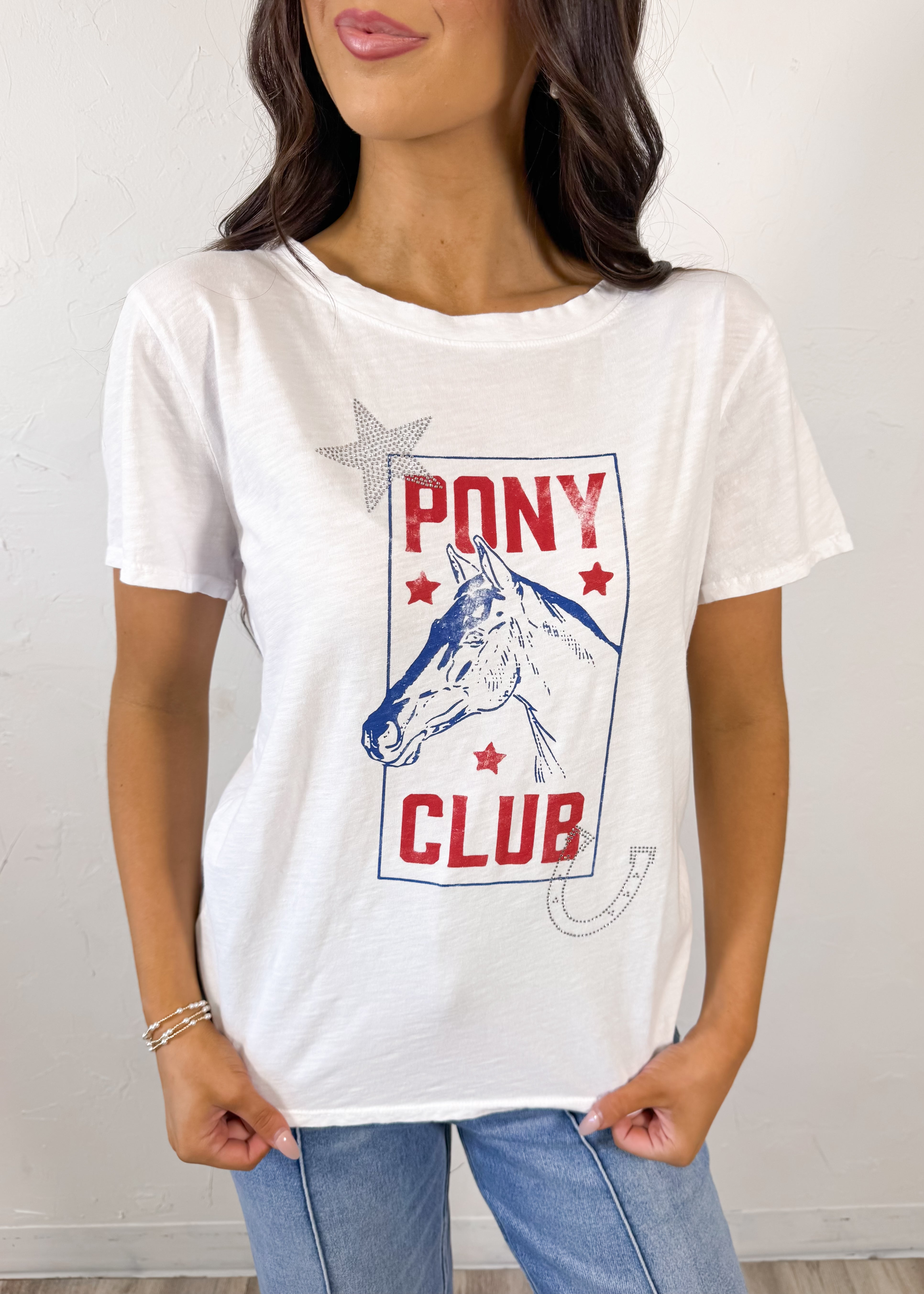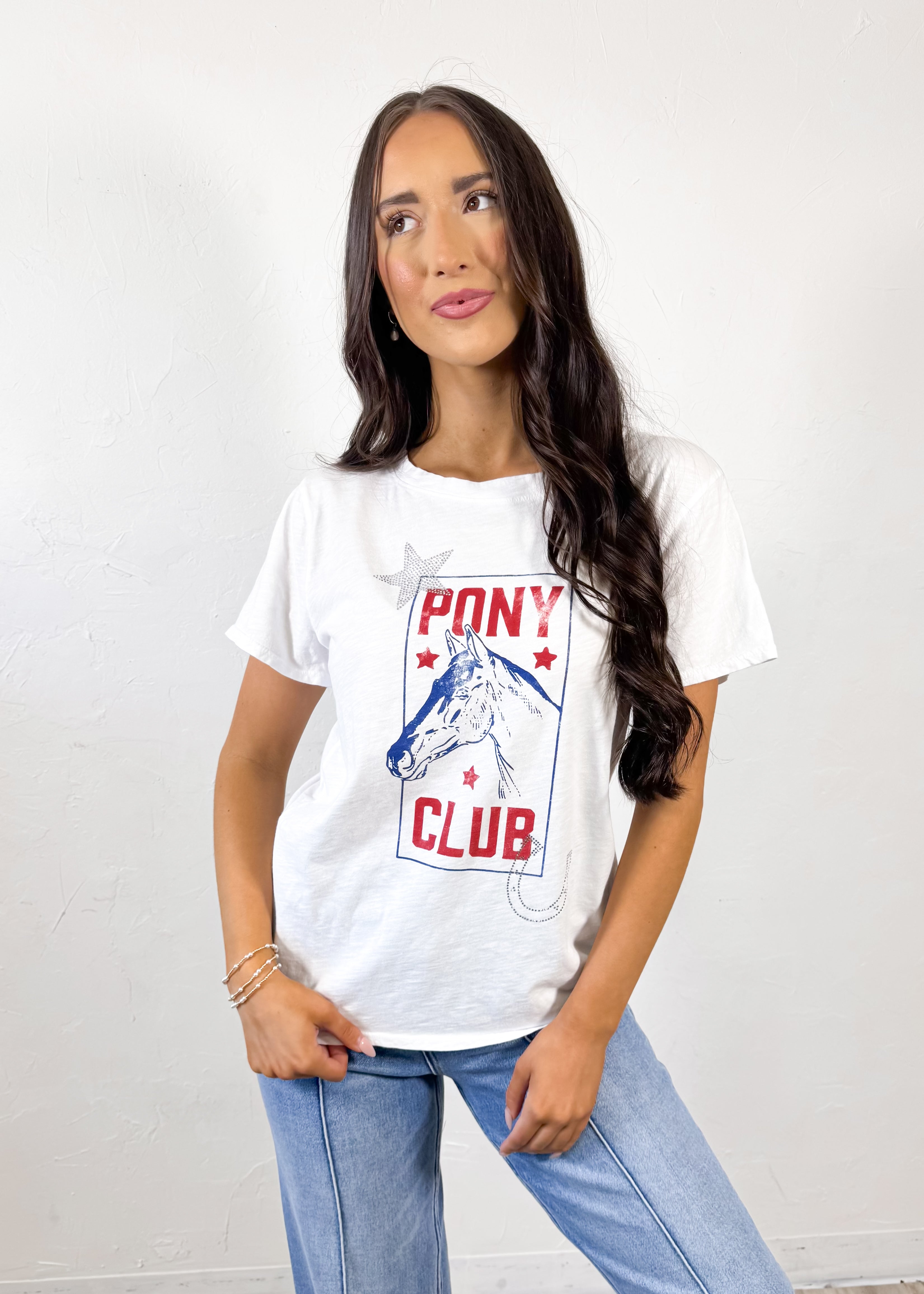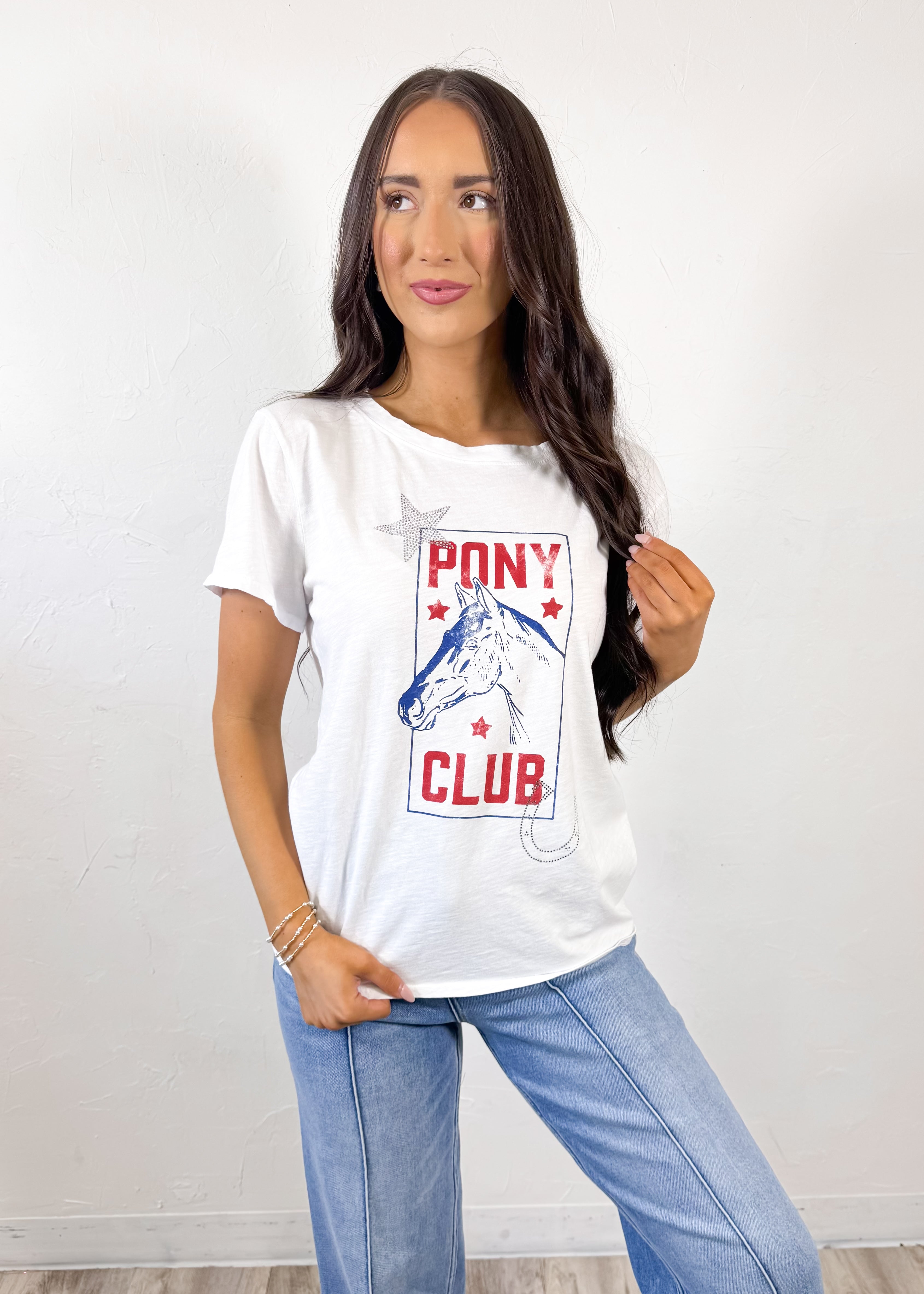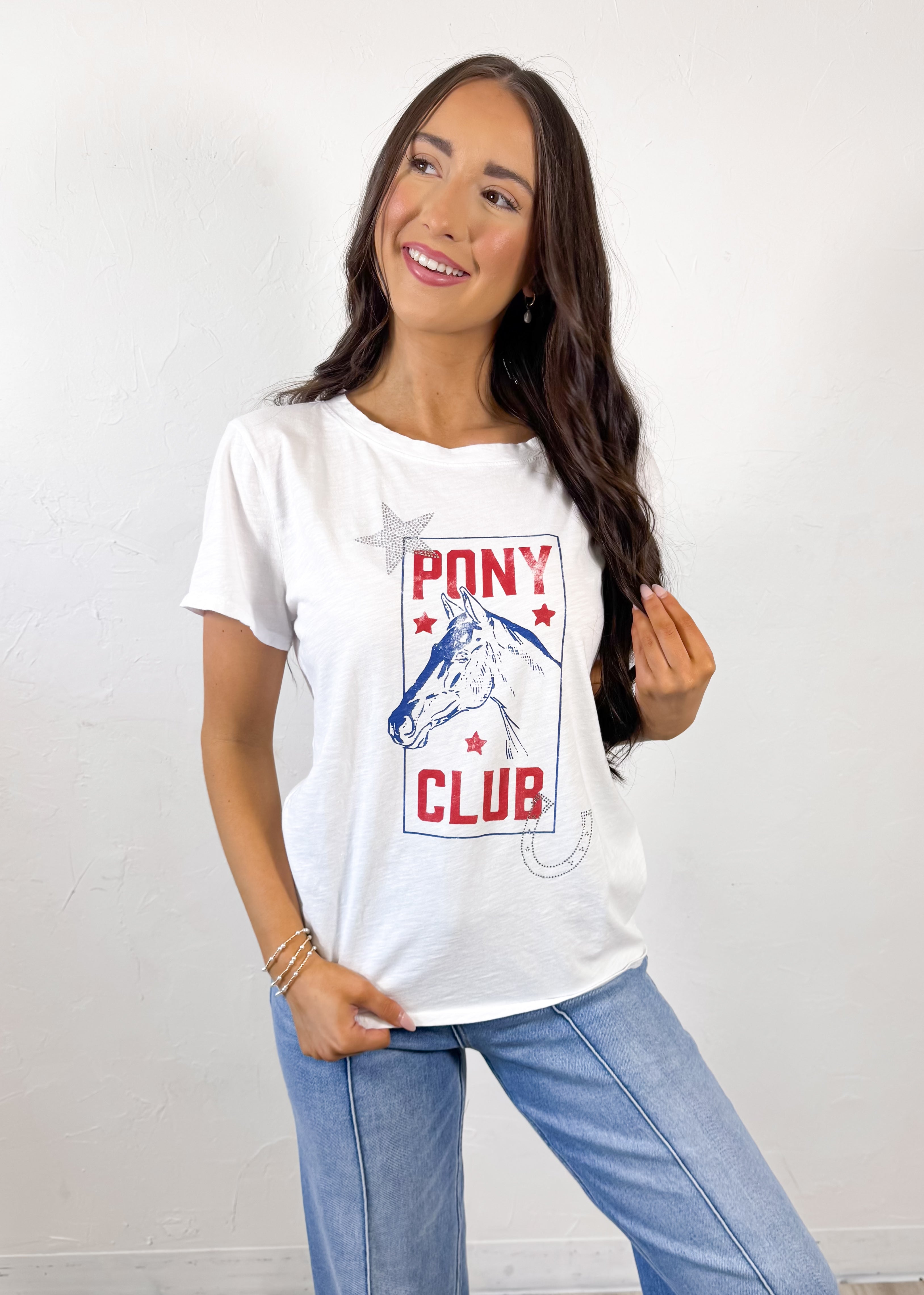 The All Us Pony Club Cap Tee in White brings the perfect vintage-inspired western vibe to your everyday wardrobe. Featuring a classic pony club graphic with star and horseshoe details, this tee gives off an effortless laid-back feel while still making a fun statement. The relaxed fit makes it easy to wear and style for casual days year-round.