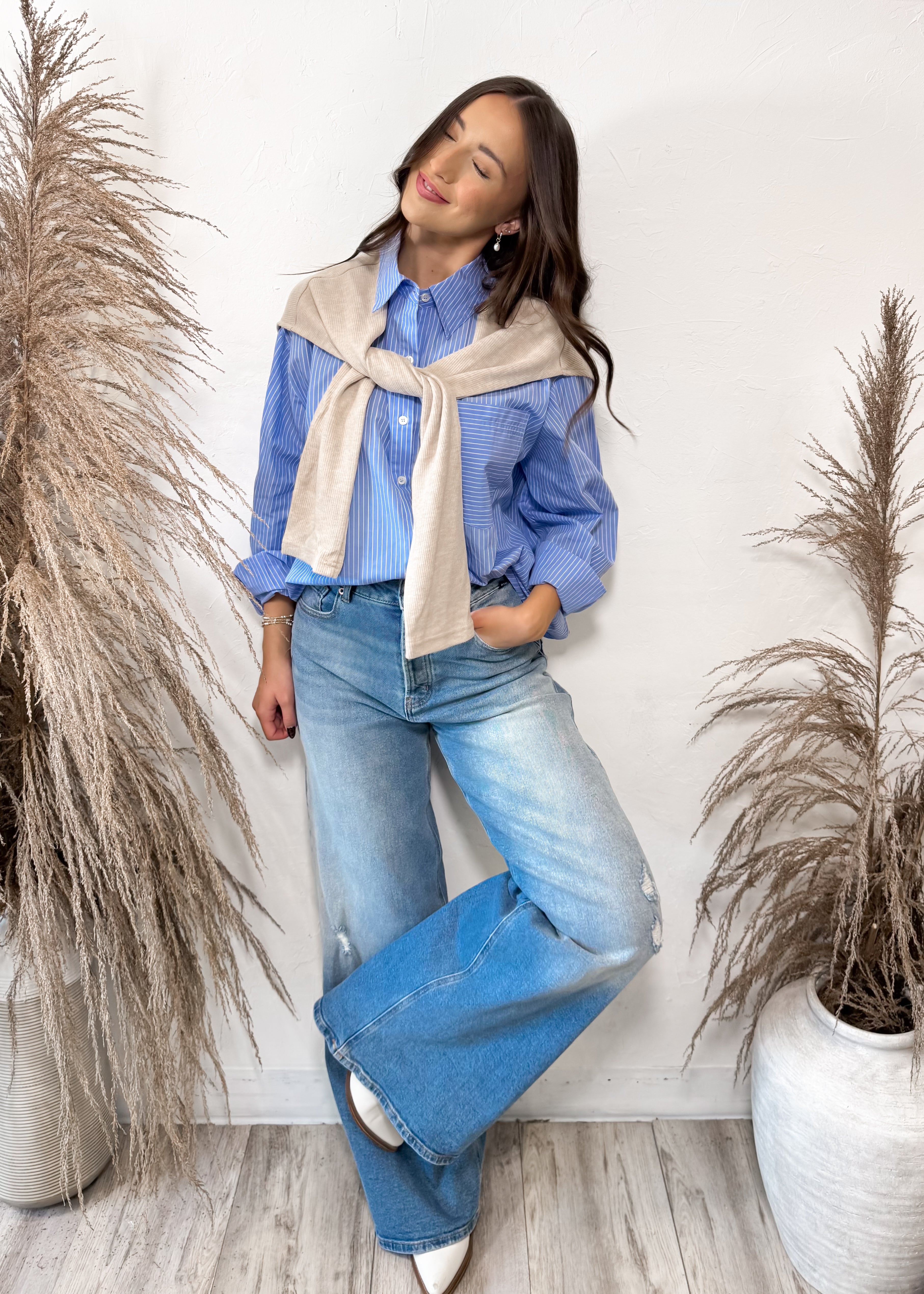 Her crisp blue-and-white stripes meet pearly buttons for that Pinterest-rich-in-the-city vibe we all love.