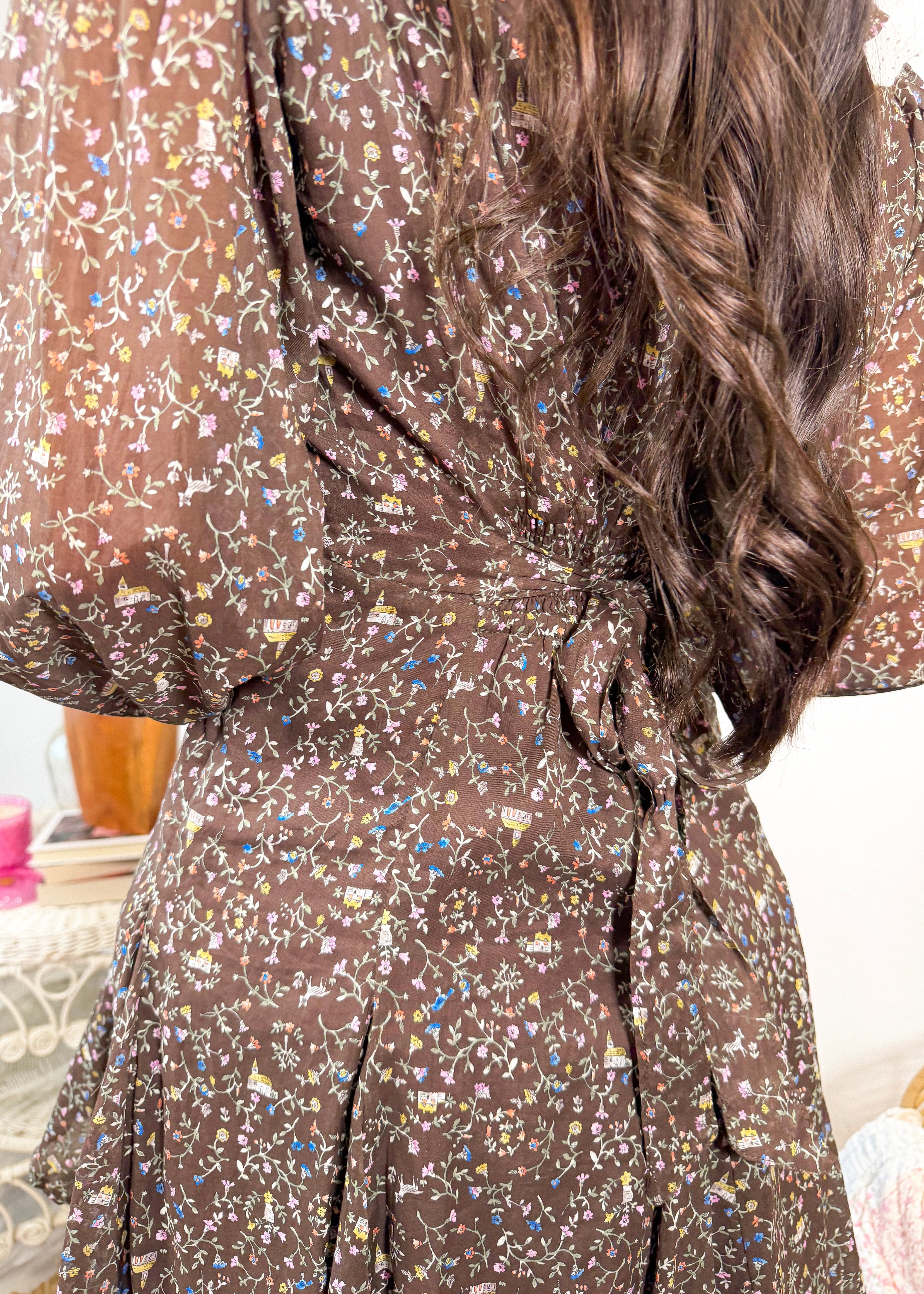 - A dainty all-over micro-floral print in soft winter hues on a warm cocoa-brown base