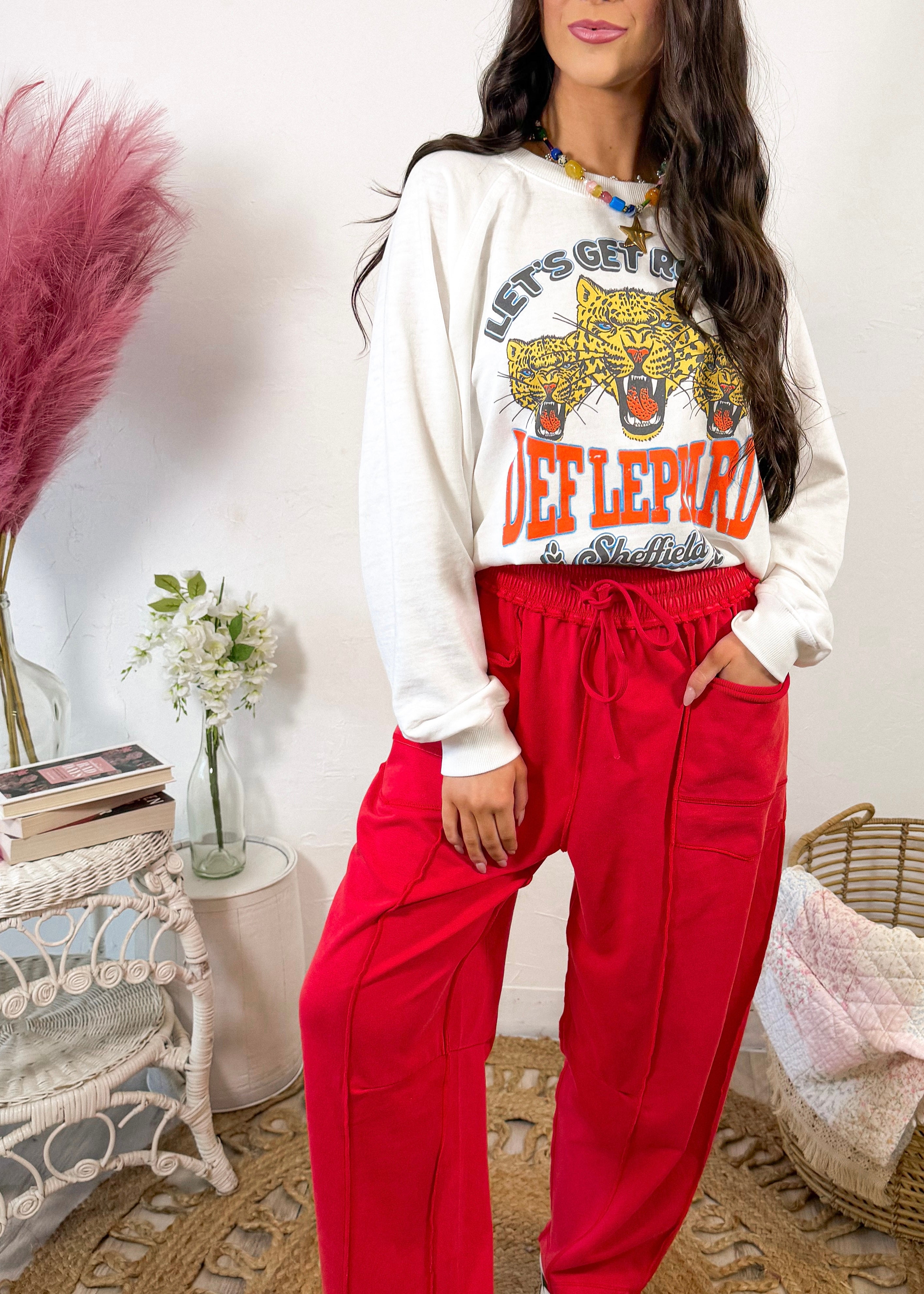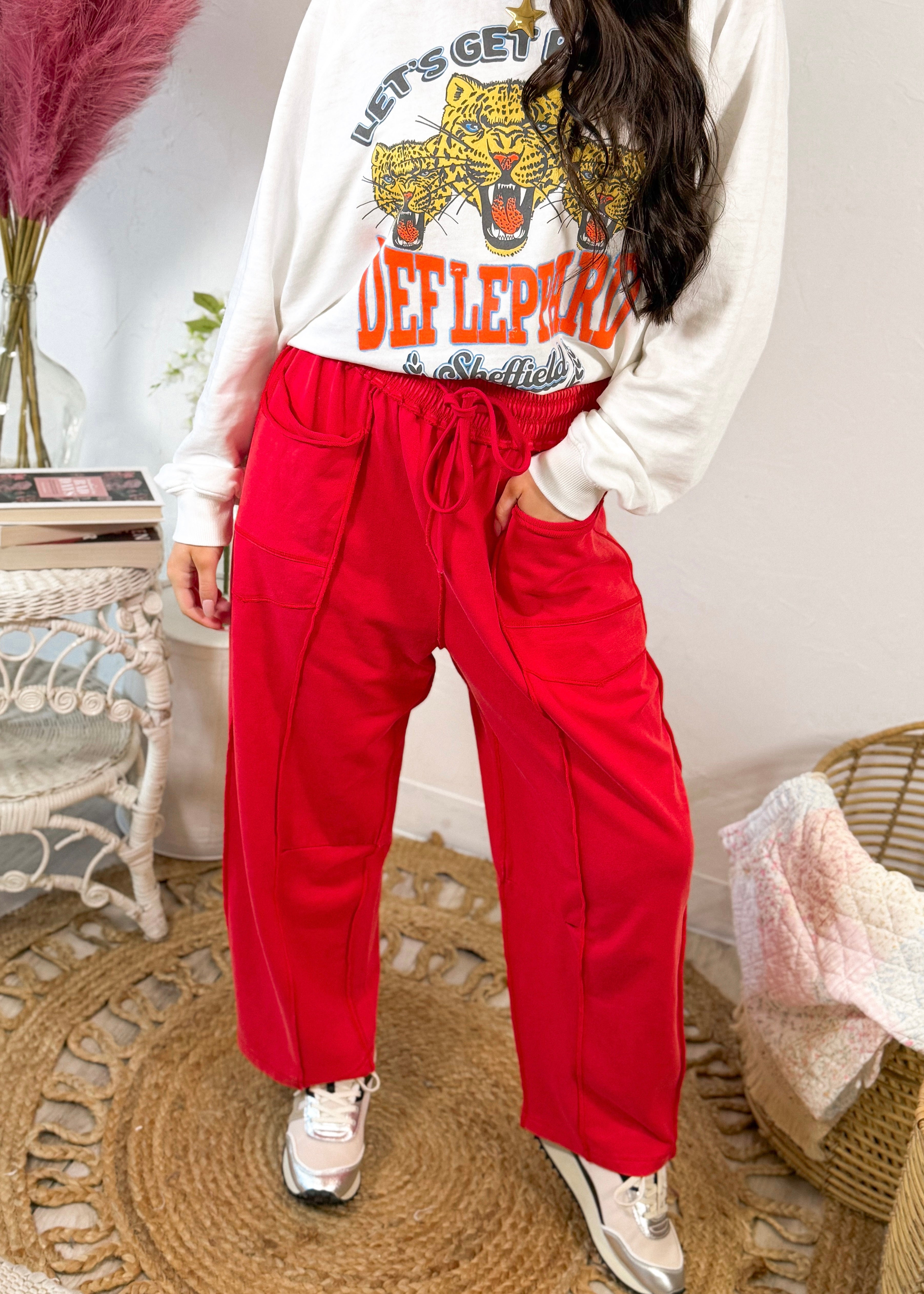 An easy stretch waistband with adjustable drawstrings keeps the fit comfy and customizable, while double front pockets add both function and laid-back charm. The reverse seam detailing gives these pants that cool, elevated edge that sets them apart from your average wide-leg pant.