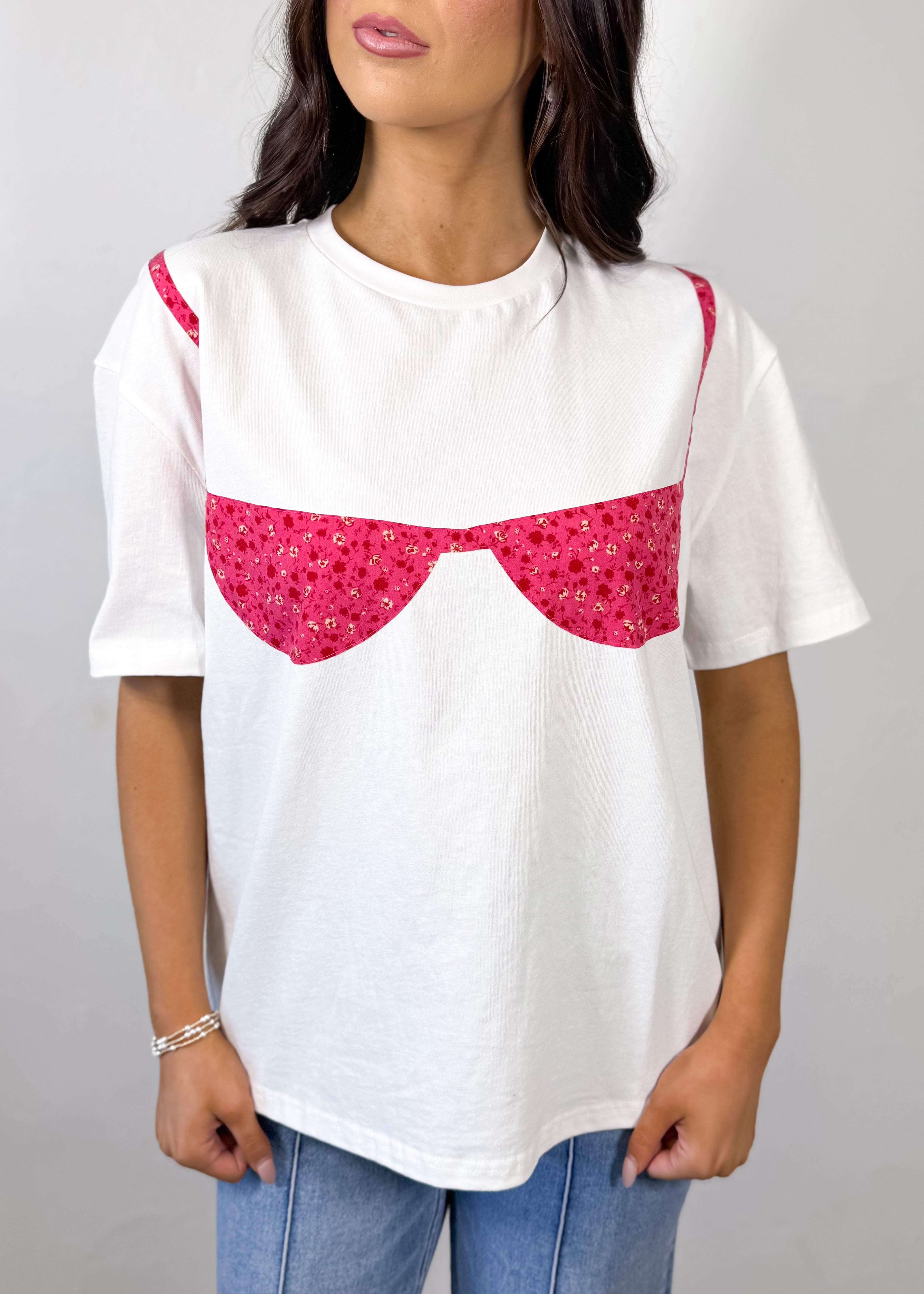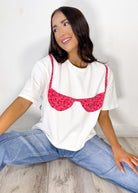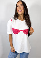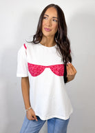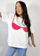 The Sweet Grace Bikini Patchwork Tee is the ultimate fun and trendy graphic for spring and summer. Designed in a soft ivory base with a statement bikini patchwork detail, this tee brings the perfect playful, beach-ready vibe to your everyday wardrobe. Featuring a relaxed boxy fit, it offers an easy, comfortable feel that’s effortlessly on trend.