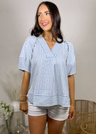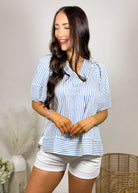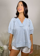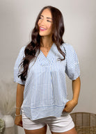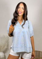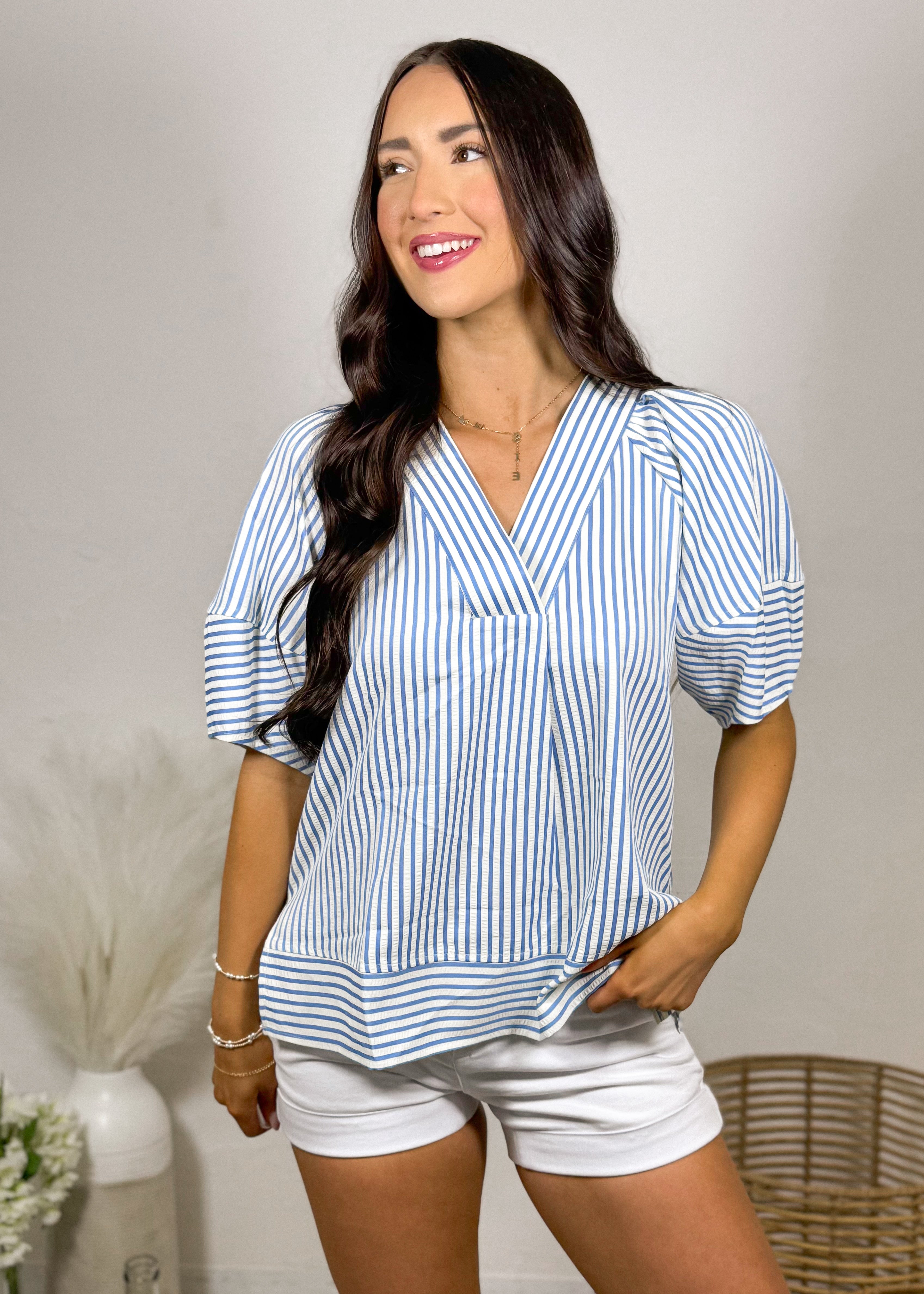 This top is what easy, polished style looks like 🤍 The blue and white stripe combo gives it that fresh, classic feel while the silhouette keeps it soft and feminine.