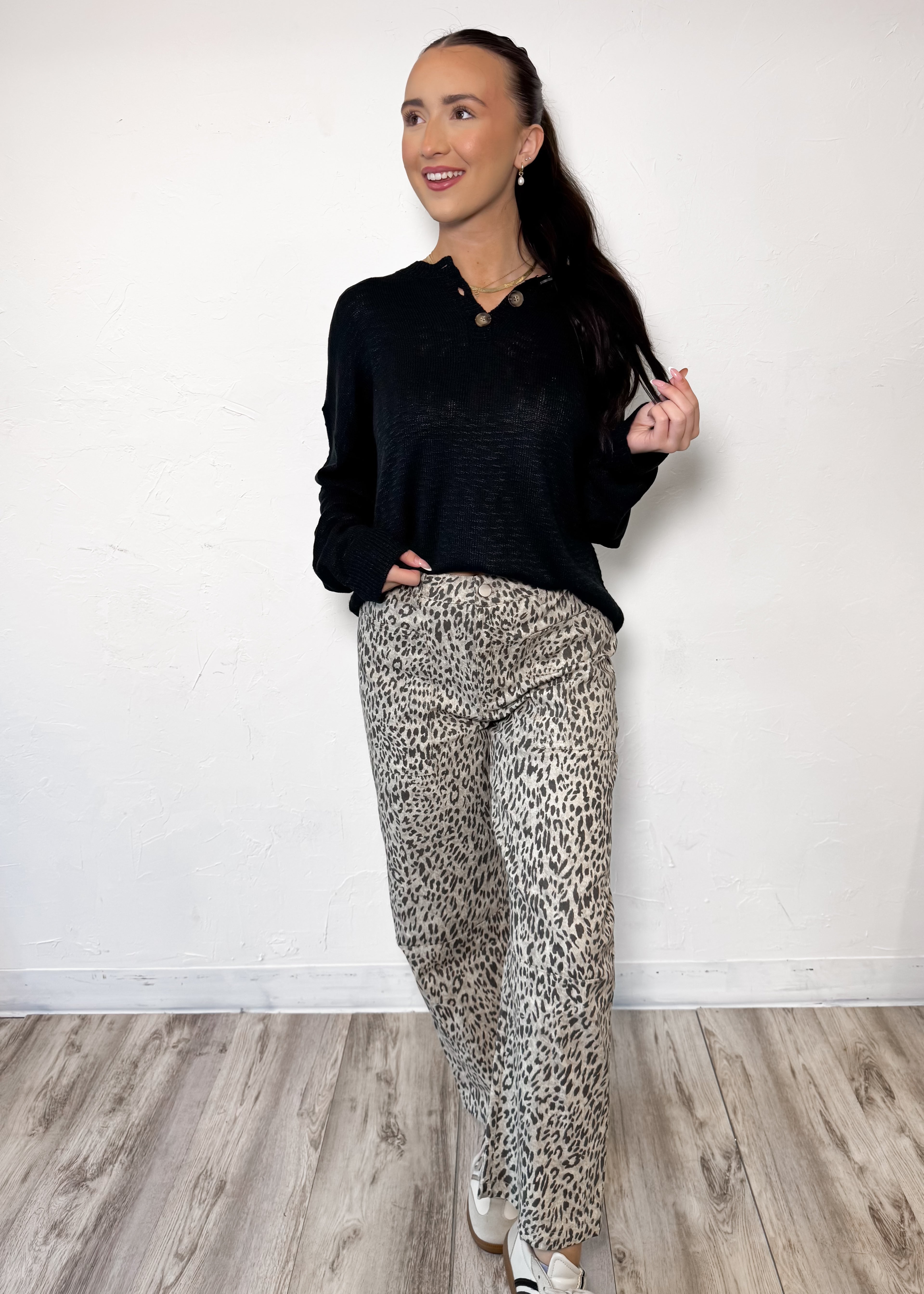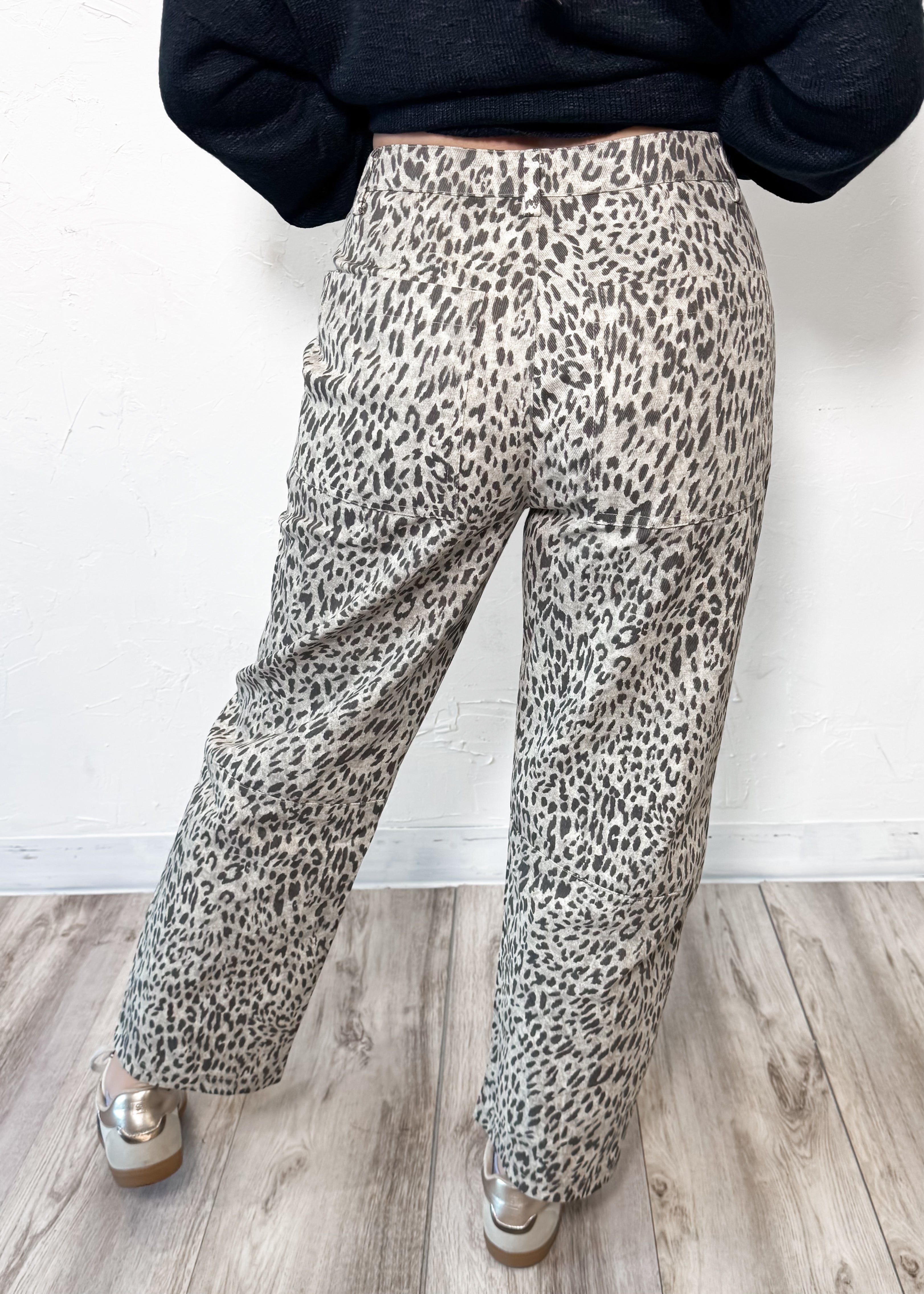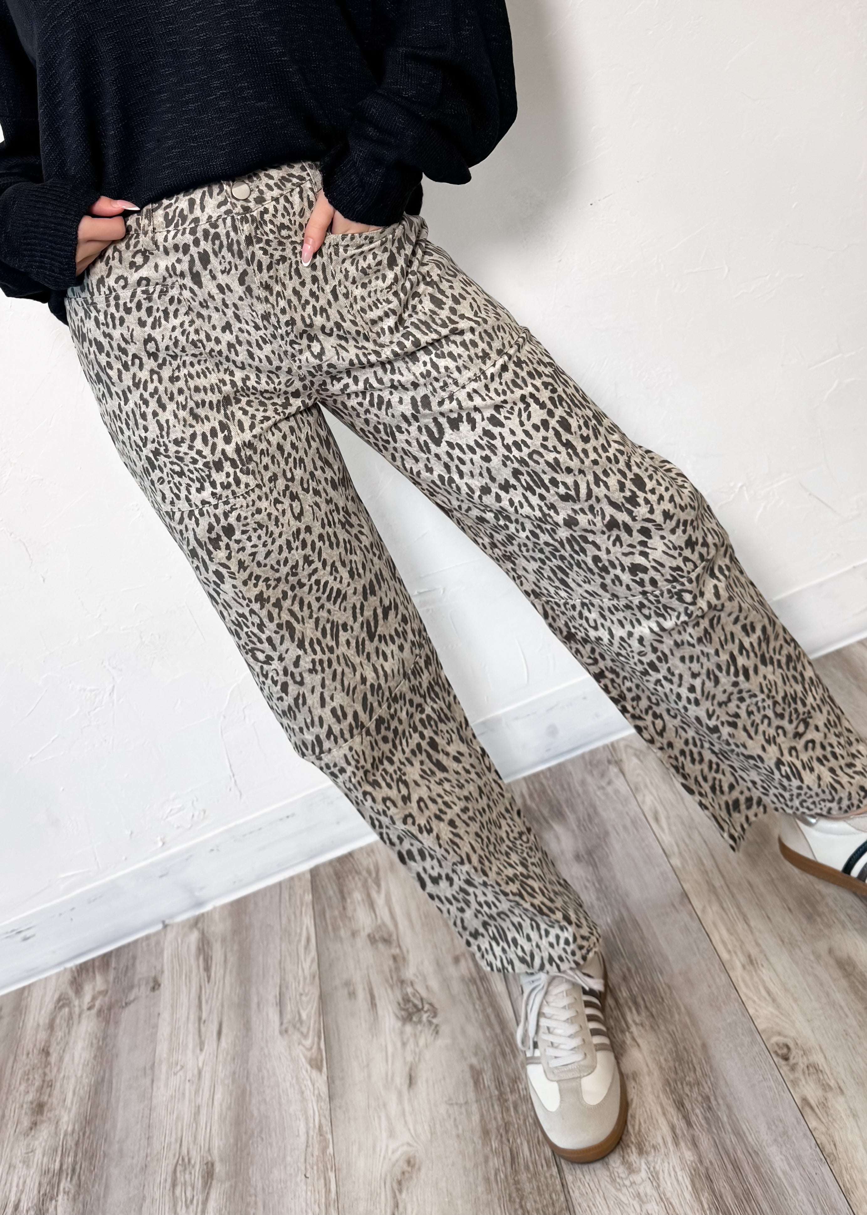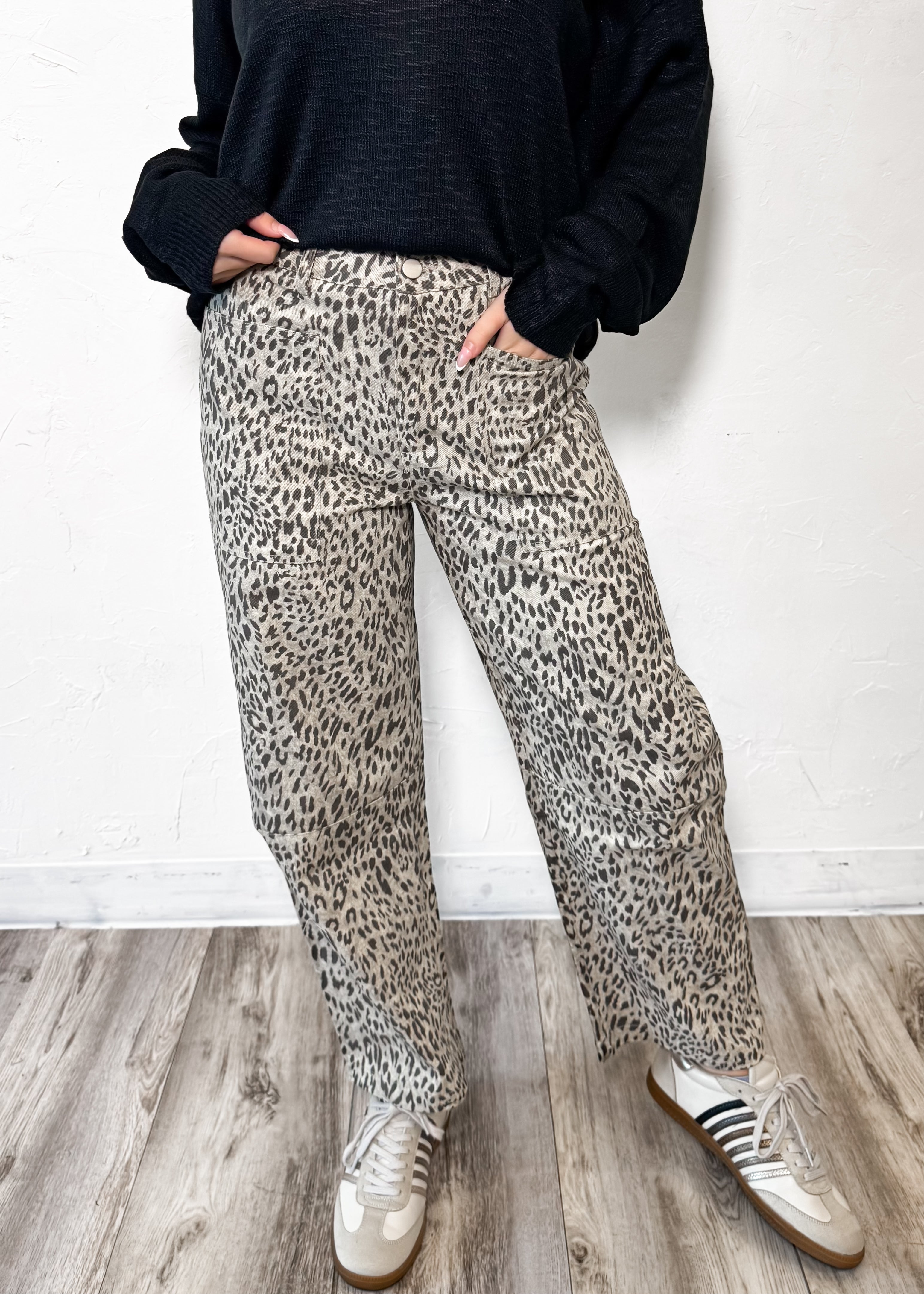 Bold, effortless, and made to stand out — the Wild Card Barrel Leg Jeans bring a fresh twist to classic denim. Designed with a relaxed low-rise waistband and an on-trend barrel leg silhouette, these leopard print jeans deliver that perfectly undone, cool-girl vibe.